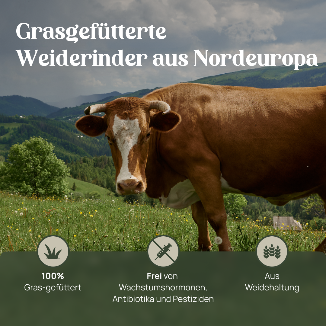 Unsere Weiderinder ernähren sich ausschließlich von biologisch angebautem Gras, das ohne den Einsatz von Pestiziden oder künstlichen Düngemitteln wächst. Das garantiert nährstoffreiches Fleisch in höchster Qualität – frei von Gentechnik und jeglichen Zusatzstoffen.